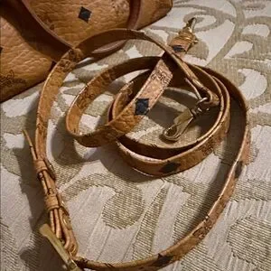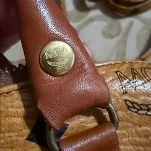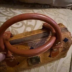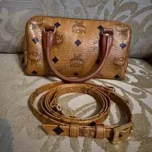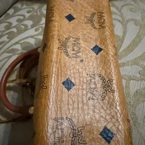 This MCM "Cognac Visetos" mini bag with logo-printed leather is showcases a body adorned with the iconic MCM monogram print, offering a blend of luxury and practicality. Its structured design and top zip closure make it a stylish and functional accessory for any occasion.