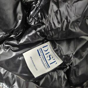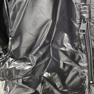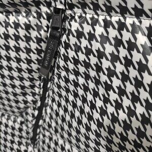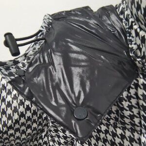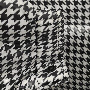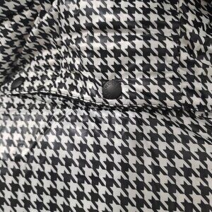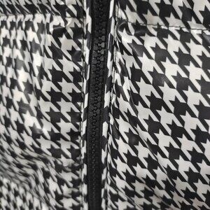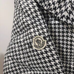 Black and white houndstooth glossy fabric with a black glossy hood, elastic cuffs and hem, left sleeve adorned with a Moncler circular logo.