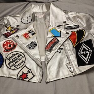 Hot & Delicious Silver Faux Leather Moto Biker Jacket with Patches Size Small