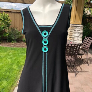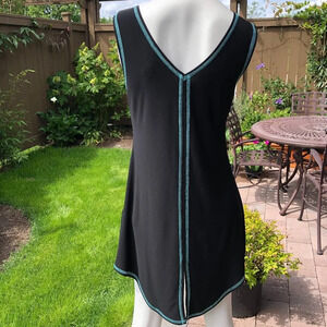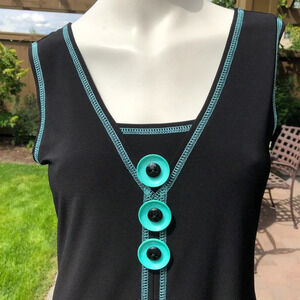 Features: sleeveless, v neck (front & back), 3 prominent button detail, big stitching in Aqua - striking against the Black, center slit front + back, angle hemline, can be worn as a dress or tunic, stretch, casual, summer