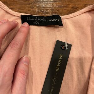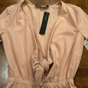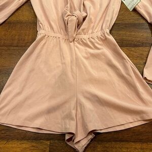 Great condition- no holes or stains. NWT House of Harlow 1960 x Revolve Pink Romper Women’s Size Small Flare Sleeves. Super cute! Front is v-neck with a knot at the bottom. No size tag but measures as a small.