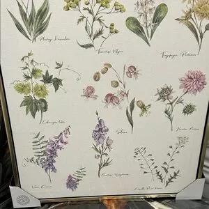 Beautiful floral botanical canvas art with various flowers. Features a mix of colors including green, yellow, pink, and purple.