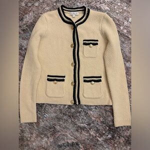 Elegant women's cream cardigan sweater featuring stylish black trim and gold button accents. Perfect for adding a touch of sophistication to any outfit.
