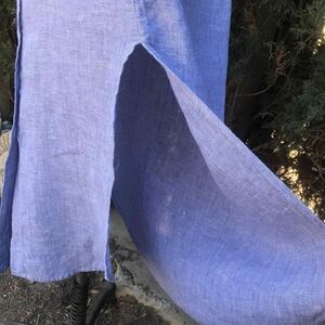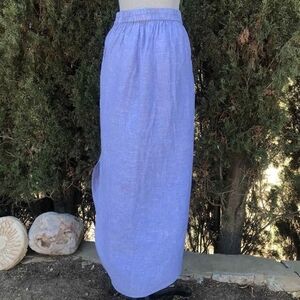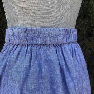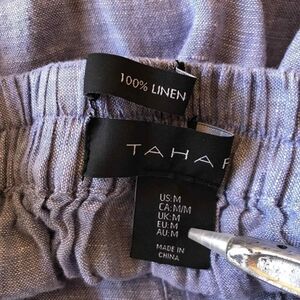 High Rise skirt by Tahari. 100% linen. Has a button down closure. Has split openings on both sides. Stretchy waistband. Labeled as a size Medium. Has a small light stain (shown in the last picture) but otherwise it's In Perfect Condition!