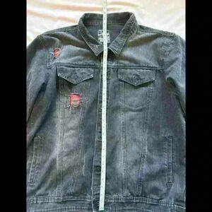Trendy Krome designer Distressed Denim Jacket with Red Plaid Accents