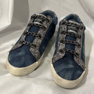 Elevate your casual look with these stylish Vintage Havana slip-on sneakers. Featuring a unique blue denim upper with distressed detailing and a bold silver chain-link accent across the vamp. The glittery silver heel adds the perfect amount of sparkle.
