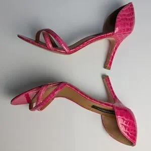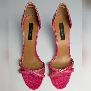 Alligator texture embossed leather strappy heels from Ann Taylor. These are in good pre-owned condition with some wear to soles. The stitching on one insole label is coming loose, as pictured.