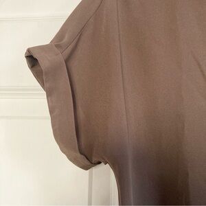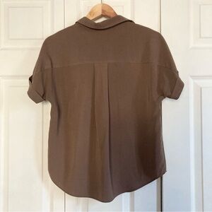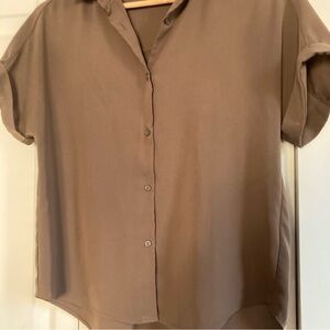 GU short-sleeve button-down blouse in a versatile brown tone. Features a relaxed, boxy silhouette with a soft drape, making it easy to wear tucked or untucked. Lightweight feel with a curved hem and clean front button closure. Includes an extra replacement button attached on the interior tag.