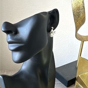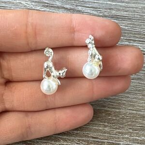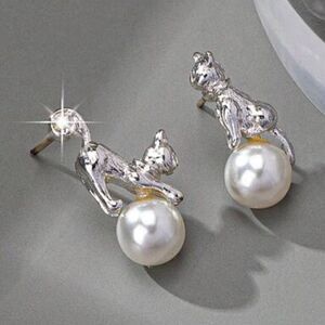Cat with pearl detail stud earrings in silver hardware