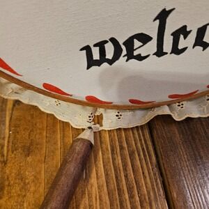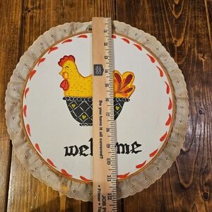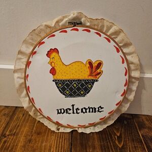 Charming vintage hand-painted wall hanging featuring a yellow chicken sitting in a basket with a bold "Welcome" script. Made on stretched fabric in a wooden embroidery-style hoop and finished with a decorative lace ruffle trim. Perfect for farmhouse, country kitchen, or cottage decor.