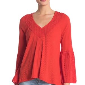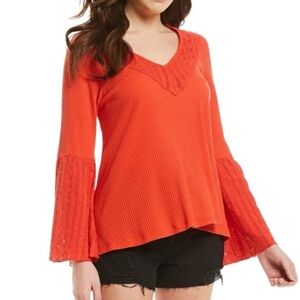 New Free People Crimson Red Ribbed Lace Bell Sleeve V Neck Top Shirt