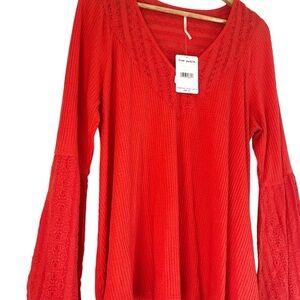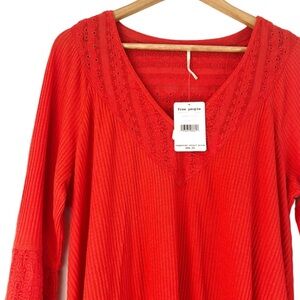 New with tag Free People Crimson red ribbed knit top with intricate lace detailing along the V-neck and flared bell sleeves. The fabric offers a textured ribbed pattern, while the lace inserts add a delicate, bohemian flair. Long sleeves with voluminous, wide cuffs provide a dramatic silhouette. Size L. Style: OB921813. Shell: 60% Cotton, 40% Polyester. Trim: 100% Cotton. Machine wash.