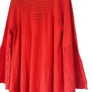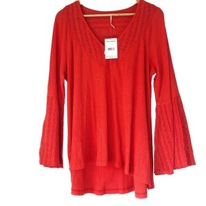 Keywords: Free People, red top, lace trim, bell sleeves, ribbed knit, boho, feminine, v neck, statement sleeve, textured, trendy, casual chic