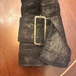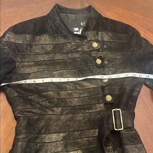 Statement luxury distressed leather jacket with a unique asymmetrical silhouette and elevated designer aesthetic. Crafted with a beautifully textured, slightly metallic distressed finish, this jacket features an elegant stand collar, elongated sleeves, decorative antique-style buttons, and adjustable buckle details that cinch the waist for a flattering, sculpted fit.