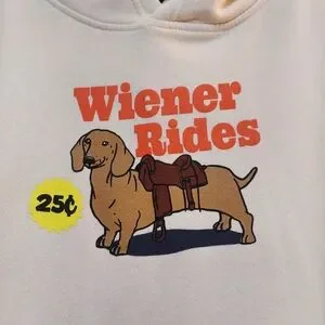 Stay cozy and stylish with this cream hoodie featuring a playful Wiener Rides graphic. Perfect for casual outings.