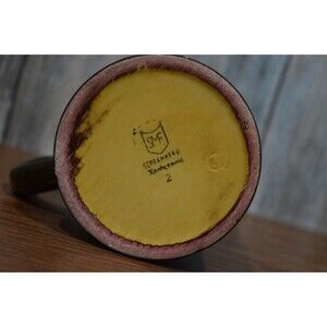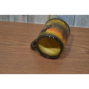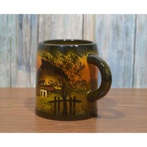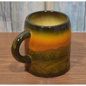 A stunning piece of vintage German pottery from the renowned Schramberger Majolika Fabrik (SMF). This beautiful mid-century mug captures the rustic charm of the Black Forest with a panoramic sunset scene featuring a traditional chalet and silhouetted pine trees. The vibrant, hand-painted details are set against Schramberg's iconic drip glaze, making this a perfect addition to any collection or a wonderful cup for your morning coffee.
