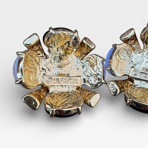 This is a pair of onyx and faux mabe pearl cabochons surrounded by crystal rhinestones and set in gold-tone metal. Circa 1990s.