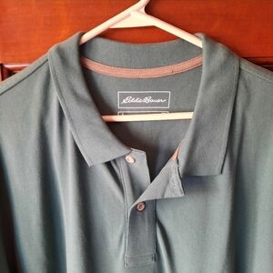 NWT Eddie Bauer 100% cotton sage green short sleeve polo shirt size XL Tall. Fold down collar with 2 button front closure, short sleeves, ribbed cuffs, longer length, and a straight hemline with side split seams. In excellent condition, never worn! Tag still attached! Lightweight material 100% cotton. Size XL Tall.