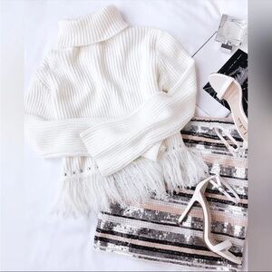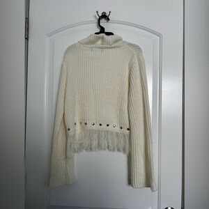 Lulu's Cream White Studded Freethinker Cropped Fringe Turtleneck Ribbed Knit Sweater