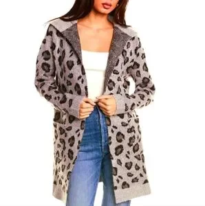 This striking Rachel Zoe Leopard Print Long Cardigan Lagenlook Boho Sweater features a button closure, two front pockets, and a collared neckline.