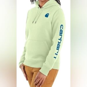Cold winter mornings are a lot more comfortable with this women's cozy hoodie. Made of heavyweight fleece, the sweatshirt is brushed on the inside for extra softness. It has a relaxed fit that allows for easy layering, and it's finished with a Carhartt logo down the sleeve.