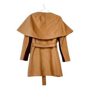 Waverly G Waterfall Short Coat Drape Collar Transition to Hood Cinch Belt Tan S