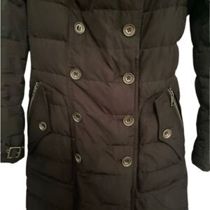 Stay warm in iconic style with this timeless Burberry Brit quilted puffer coat. Designed in classic black, this coat features Burberry’s signature check lining, a flattering tailored silhouette, and cozy down filling for superior warmth. The double-breasted front adds a sophisticated touch, while the hood with faux-fur trim offers both function and elevated style.