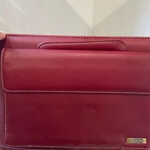 Stylish maroon laptop bag. Features structured handles. Front pocket for easy access.
