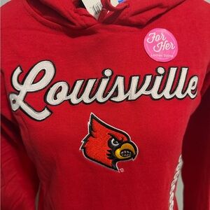 Go Cards! Cozy red hoodie with embroidered Louisville text and Cardinals logo. Features a front pocket and drawstring hood. Women’s fitted style. Cotton and polyester blend is lightweight for spring or fall. Two available in Small.