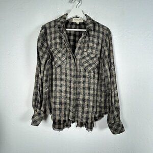 Cloth & Stone Womens Gray Black Checkered Fringe Trim Button Down Shirt Small
