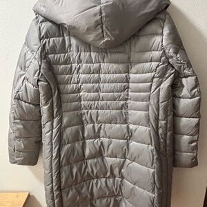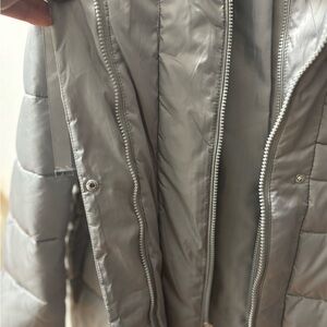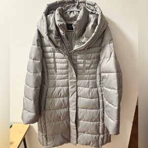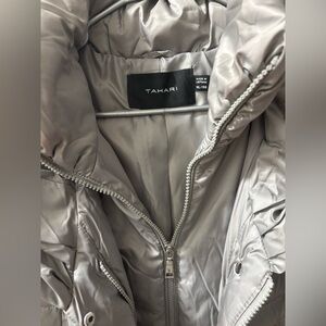 Chic and warm puffer by Tahari. Features a sleek silver design and is knee length. Perfect for cold weather or snow. Used once, in perfect condition!
