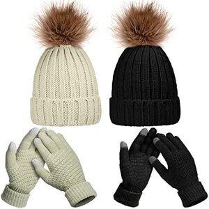 Fabric: Acrylic fiber hat with faux pom-pom, cotton blend gloves