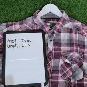 Keywords: BKE, flannel shirt, plaid shirt, long sleeve, button up, maroon, athletic fit, menswear, casual shirt, XL, extra large, button-down shirt, western shirt, chest pockets
