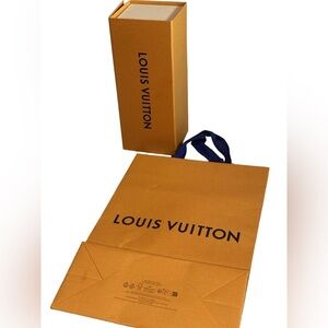 Elevate your gifting with this authentic Louis Vuitton packaging set in excellent used condition (EUC). Includes a small LV shopping bag with signature navy ribbon handles and a large LV perfume box with coordinating wrapping paper.