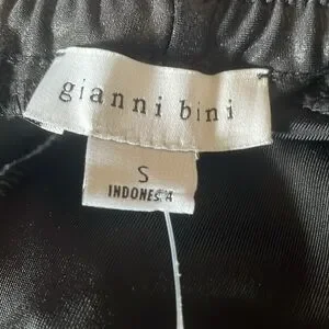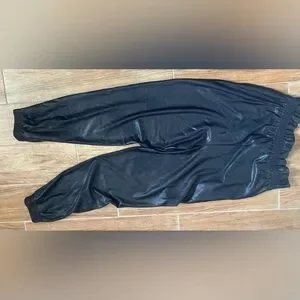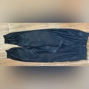 Elevate your style with these sleek black jogger pants. Perfect for any occasion, they offer comfort and a modern look. Shirred elastic, paper bag waist. Front side pockets Elastic at ankles. Fabric tag cut out of my pair, but I found another pair listed for sale and have added that to my listing.