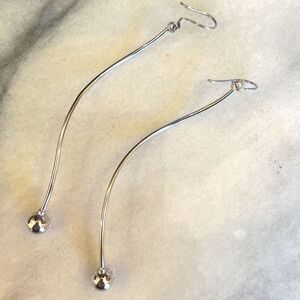 Minimalist silver plated drop earrings with wave and ball. These super sleek wavy drop earrings are approximately 3.5 inches long and hang from hypoallergenic wire hooks. If you find something you love feel free to send an offer!