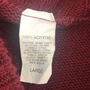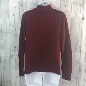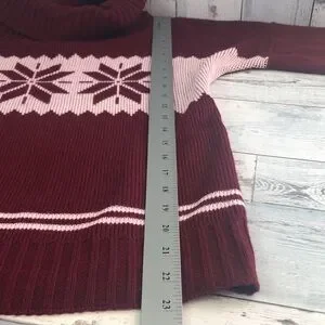 Maroon/burgundy, white snowflakes, ribbed trim, cowl neck, brand unknown,colors may vary due to lighting, good used condition, Sz: L