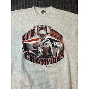 Vintage 2002 New England Patriots Tom Brady Super Bowl Sweatshirt in gray, perfect for all-season wear. This men's XL sweatshirt features a crew neck, long sleeves, and a pullover closure. It is made of a comfortable cotton blend with a fleece fabric type, and is machine washable. The sweatshirt has a solid pattern with a graphic print featuring Tom, NFL, Tom Brady, Vtg, Champion, Football, and logos. This heavyweight sweatshirt has accents with a nature, art, USA, dad, city, classic, football, retro, patriots, hipster, patriotic, school, NFL, college, outdoor, 90s, hip hop, sports, and vintage themes. It is perfect for gym & training, walking, and football.
