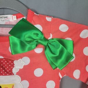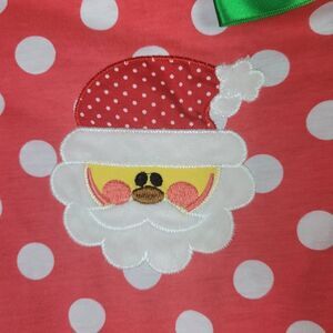 Adorable Santa dress with a festive 3-layer tulle skirt, a bright green ribbon at the neck and a sweet red ribbon with white polka dots at the waistline!