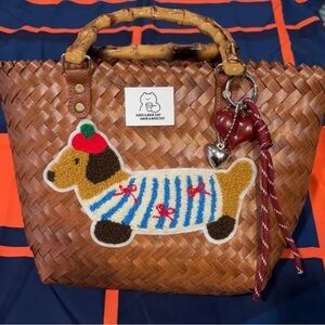 Charming brown woven tote bag featuring a playful dog patch. Perfect for adding a touch of fun to your outfit.