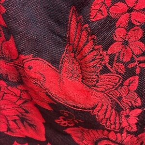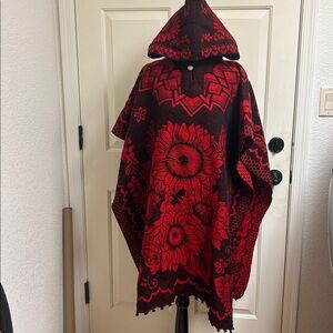 Poncho, Red and Black, Floral Hooded Hummingbird, Butterfly, Flower design, 38 “ Across, 37” Length, Excellent Condition