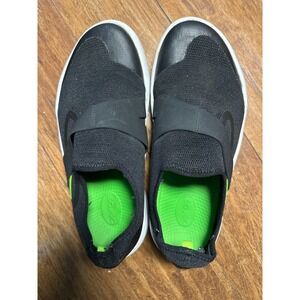 Comfortable slip-on sandal, a unique recovery shoe designed for post-workout relief and everyday wear. These sandals feature a sleek, minimalist design with a wide strap across the vamp for a secure fit. The shoes are primarily black with vibrant green accents around the insole and a stripe near the ankle, adding a pop of color. Ideal for wearing after sports, at the gym, or simply for relaxing around the house.