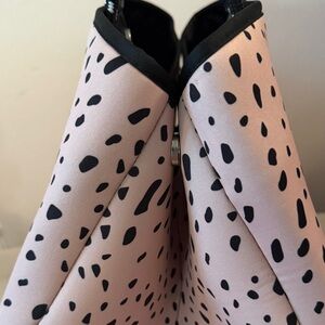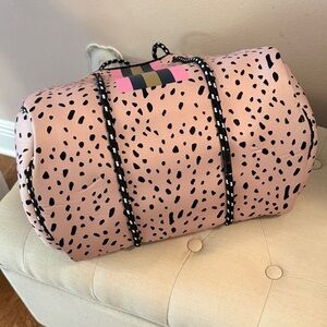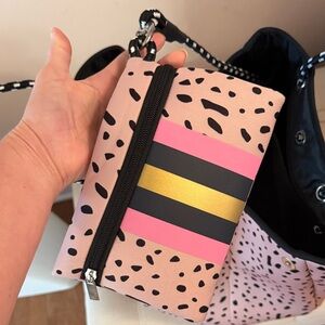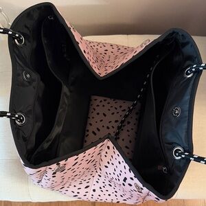 Elevate your style with this chic pink and black tote bag. Perfect for any occasion. Stripes are pink, gold and navy. Fabric is like a scuba diving material. Cord looks like bungee cord but it didn’t not have any stretch to it. Two large zippered pockets on each dude. Comes with a smaller purse and 2 keychains that can hold lipstick? Never been used.