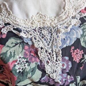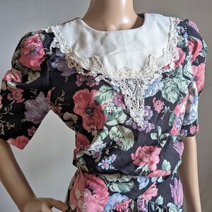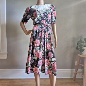 Vintage 1980s Jodi Michaels floral midi dress. Shoulder pads, short sleeves. Floral crochet collar. Drop waist. Button up back with zipper. Dress is in good vintage condition with possible loose threads and light fading to fabric.