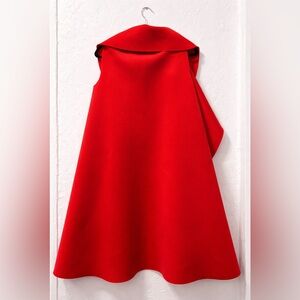 Bold, elegant red draped cape vest (capă) that instantly upgrades any outfit. This piece has a dramatic waterfall front / oversized lapel and a clean, structured back—perfect for layering over a blouse, dress, or even a simple tee.
