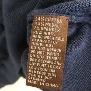 • Blue, 54% cotton, 44% model, 2% spandex blend knit fabric.