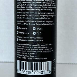 Glow Organics Magnesium Leg Spray, full 6oz bottle. Formulated with natural, 100% Dead Sea Salt Magnesium and purified water. Supports energy levels and healthy sleep while helping to relieve morning sickness, nausea, and aches and pains caused by pregnancy swelling. Convenient spray bottle offers on-the-spot relief with fast-acting Magnesium Salt.