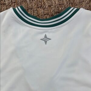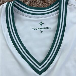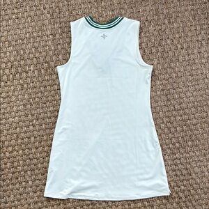 Elegant white mini dress. Features green trim on neckline. Sleeveless design. Perfect for casual outings.