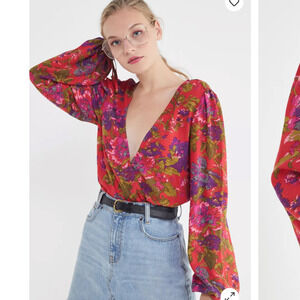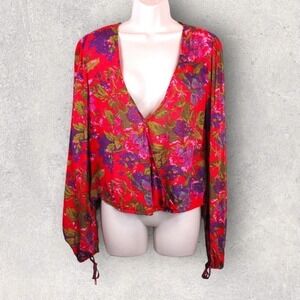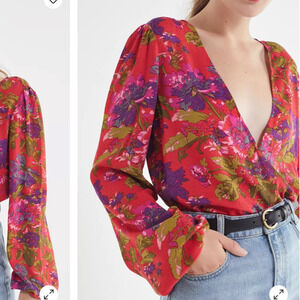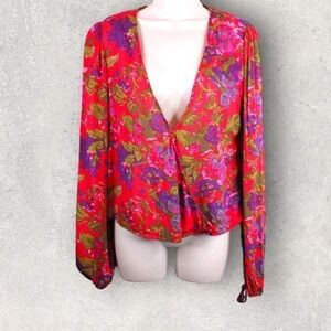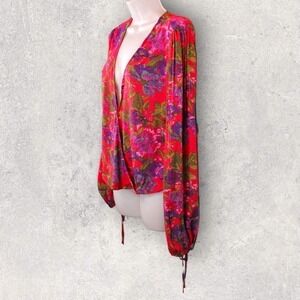UO Georgie Surplice Blouse Floral Long Sleeve in Pinks Size Large