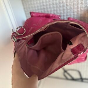 Fun and glam Coach x Poppy collaboration tote in hot pink featuring subtle but glitter text and an extra strap. The two exterior pockets have magnetic closures and the interior features classic one zipper and two slots organization.